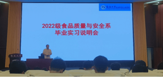 为引导学生们树立正确的实习观念,充分调动学生实习的积极性,切实推进实习工作有序开展,学院于2025年5月20日下午在社科楼报告厅召开2022级本科就业实习动员会。本次大会由学院副院长云永欢主持,学院副院长于志鹏、食品质量与安全系系主任陈健、2022级班主任和全体学生参加会议,会议由副院长云永欢主持。