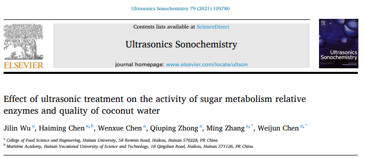 近日,beat365中国唯一官网陈卫军研究员课题组利用超声技术延长椰青贮存时间并保持椰子水的甜度,研究成果发表在《Ultrasonics Sonochemistry》(中科院1TOP期刊,影响因子7.491),题为“Effect of Ultrasonic Treatment on the Activity of Sugar Metabolism Relative Enzymes and Quality of Coconut Water”,相关技术已申请专利《变温超声耦合密闭流体局部压差(UCP)灭酶处理的椰青保存方法》(申请号:CN202010102300.6)。