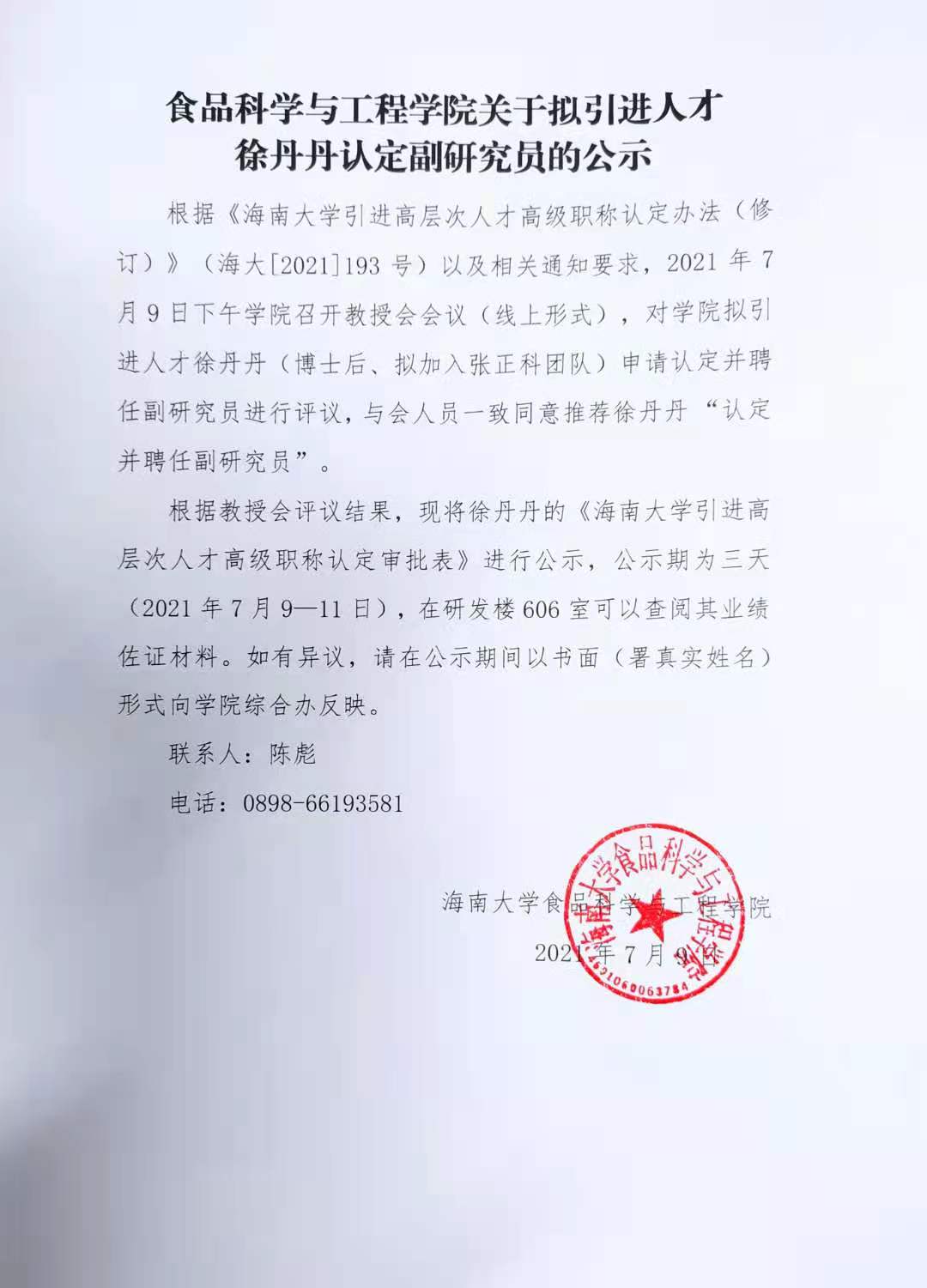 beat365中国唯一官网关于拟引进人才徐丹丹认定副研究员的公示