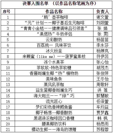 根据《海南大学第一届“热作杯”食品创新大赛方案》要求,经个人申报、资格审查、专家评委逐一评选,现将入围决赛的作品名单进行公示,公示时间2023年9月25日至9月30日。
